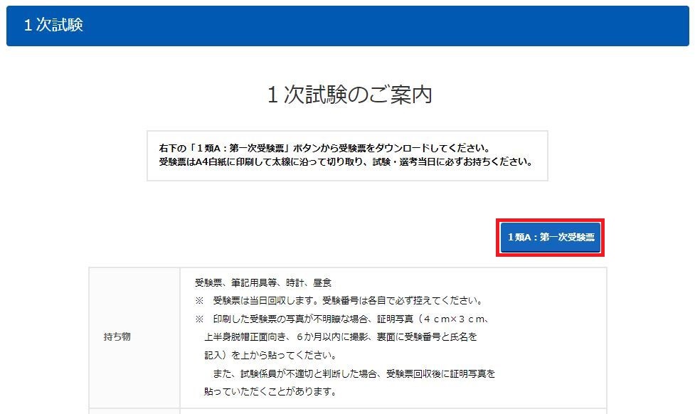 - 「第1次受験票」ボタンを押して受験票をダウンロードしてください。PDF形式でダウンロードされます。