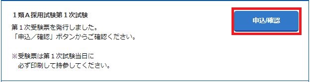 - Step Naviの表示が「第1次受験票を発行しました。」となっていることを確認し、「申込/確認」ボタンを押してください。